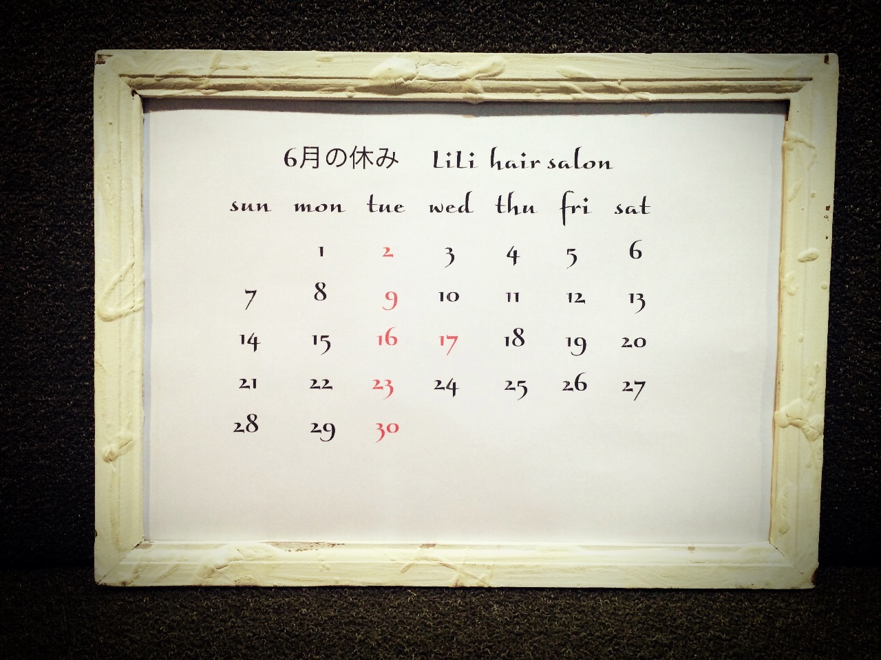 6月は通常通り火曜、第3水曜日の 2.9.16.17.23.30日をお休みしますのでよろしくお願いします。